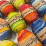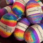 Felted Soap is an exquisite gift. There's no need for a washcloth or a loofah; take felted soap to sink, tub, or shower, and it gently exfoliates your skin. As you use soap, suds come through, and the wool will continue to felt (shrink) around the bar of soap until you are left with a little scrubby piece, perfect for cleaning.